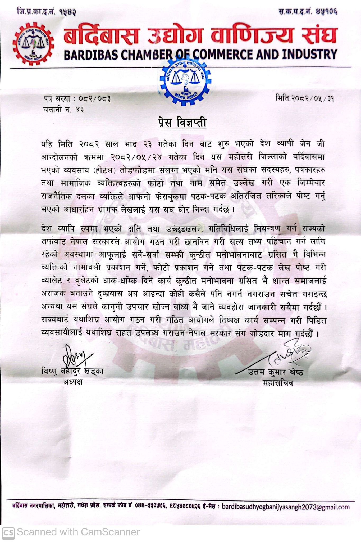 ‘बर्दिवासको होटल तोडफोडमा संलग्न रहेको भनि यस संघका सदस्यहरू, पत्रकारहरू र सामाजिक व्यक्तित्वको फोटो तथा नामसमेत उल्लेख गरी एक जिम्मेबार राजनीतिक दलको व्यक्तिले आफ्नो फेसबुकमा पटक–पटक अतिरंजित तरिकाले पोष्ट गर्नुभएको आधारहीन भ्रामक लेखलाई यस संघ घोर निन्दा गर्दछ’ विज्ञप्तिमा भनिएको छ ।