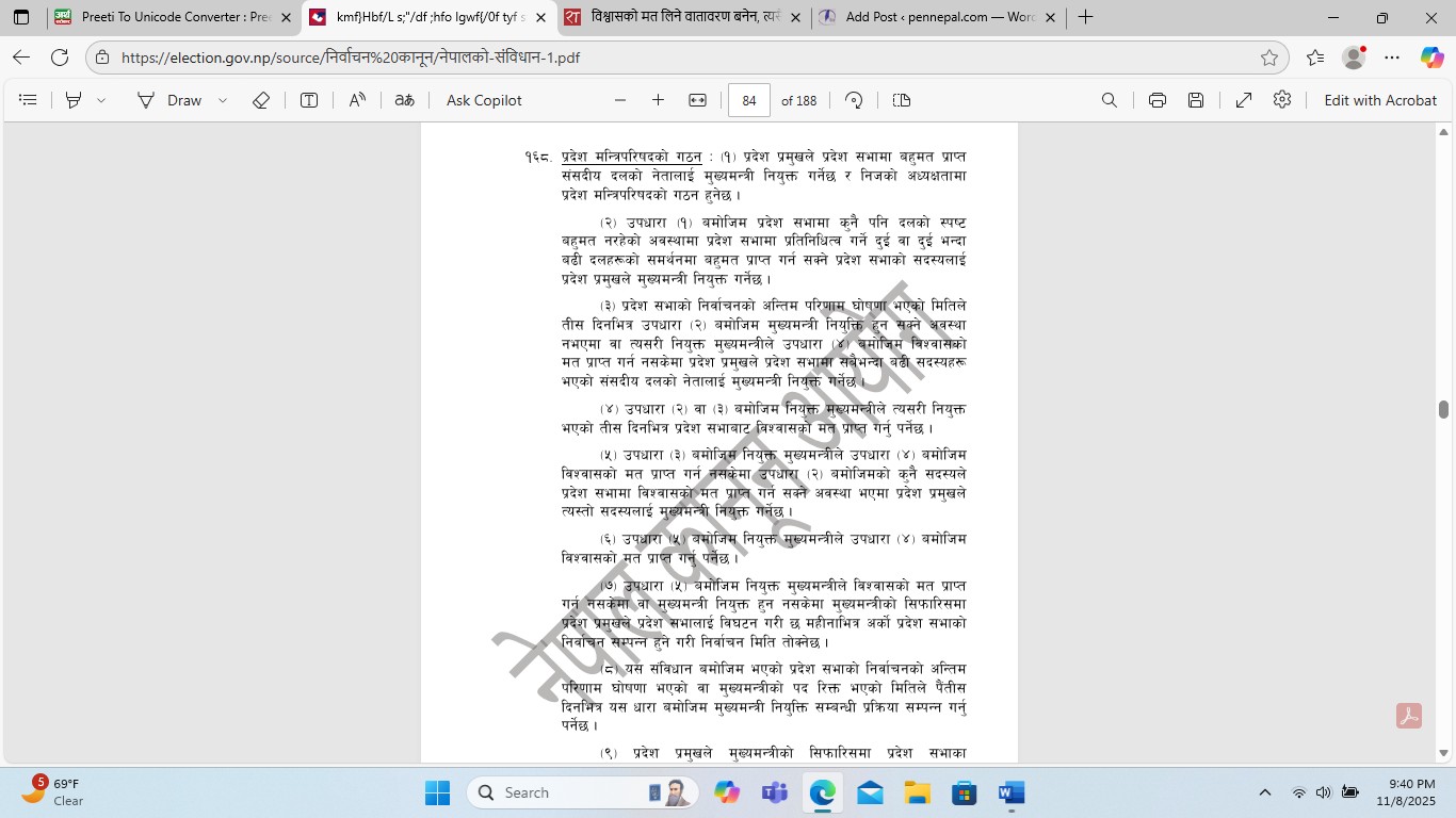 १६८. प्रदेश मन्त्रिपरिषदको गठन ः (१) प्रदेश प्रमुखले प्रदेश सभामा बहुमत प्राप्त संसदीय दलको नेतालाई मुख्यमन्त्री नियुक्त गर्नेछ र निजको अध्यक्षतामा प्रदेश मन्त्रिपरिषदको गठन हुनेछ ।